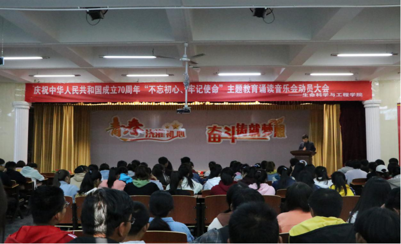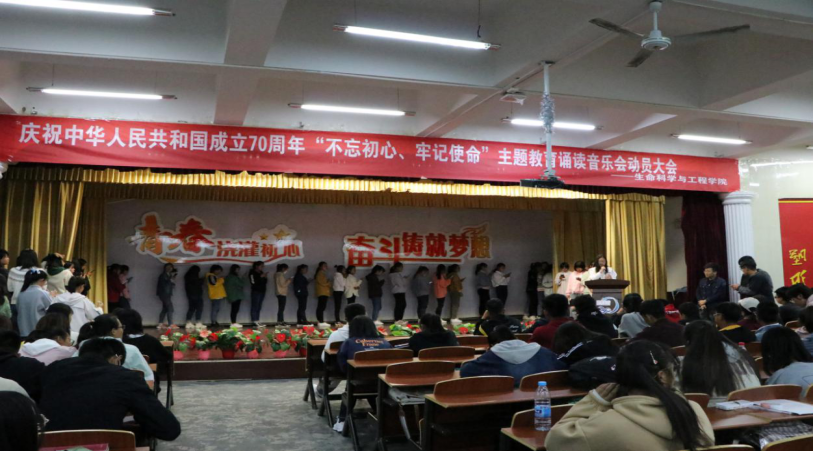 为贯彻“不忘初心、牢记使命”主题教育精神,引导全院学生学习贯彻习近平新时代中国特色社会主义思想,增强“四个意识”、坚定“四个自信”、做到“两个维护”,丰富校园文化生活,培育爱国主义精神,以诗歌朗诵形式礼赞伟大祖国。365英国上市官方网站于2019年10月21日下午4:30在学生发展中心四楼召开庆祝中华人民共和国成立70周年“不忘初心、牢记使命”主题教育诵读音乐会动员大会,共计150余人参加了此次大会。