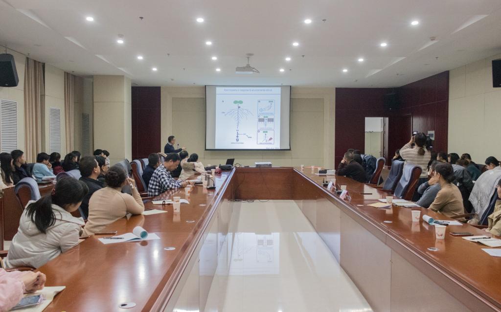 指导会上,两位专家听取学院发展概况汇报后,细致讲解了学科和专业建设涉及的各个环节的内容,并结合他们在河西走廊的具体项目研究作了专题辅导。晚上的学术报告会上,黎家教授就其研究领域BAK1在BR信号途径中的重要作用、RGIs作为RGF1的受体调控植物根生长发育作用以及根的向水性机制等展开,着重讲解了植物向性生长的调控机制,研究成果对培育抗旱保产的作物育种工作具有重要的指导作用。王锁民教授从草类植物逆境生理与基因工程及荒漠草原恢复治理方面的研究工作和荒漠旱生植物霸王(Zygophyllum xanthoxylum)角质层脂质转运蛋白编码基因ZxABCG11转入紫花苜蓿为专题,讲解了如何对紫花苜蓿进行遗传改良的学术报告,其研究成果对我国北方干旱、盐渍及瘠薄的边际土地治理及开发利用具有重要的现实意义。