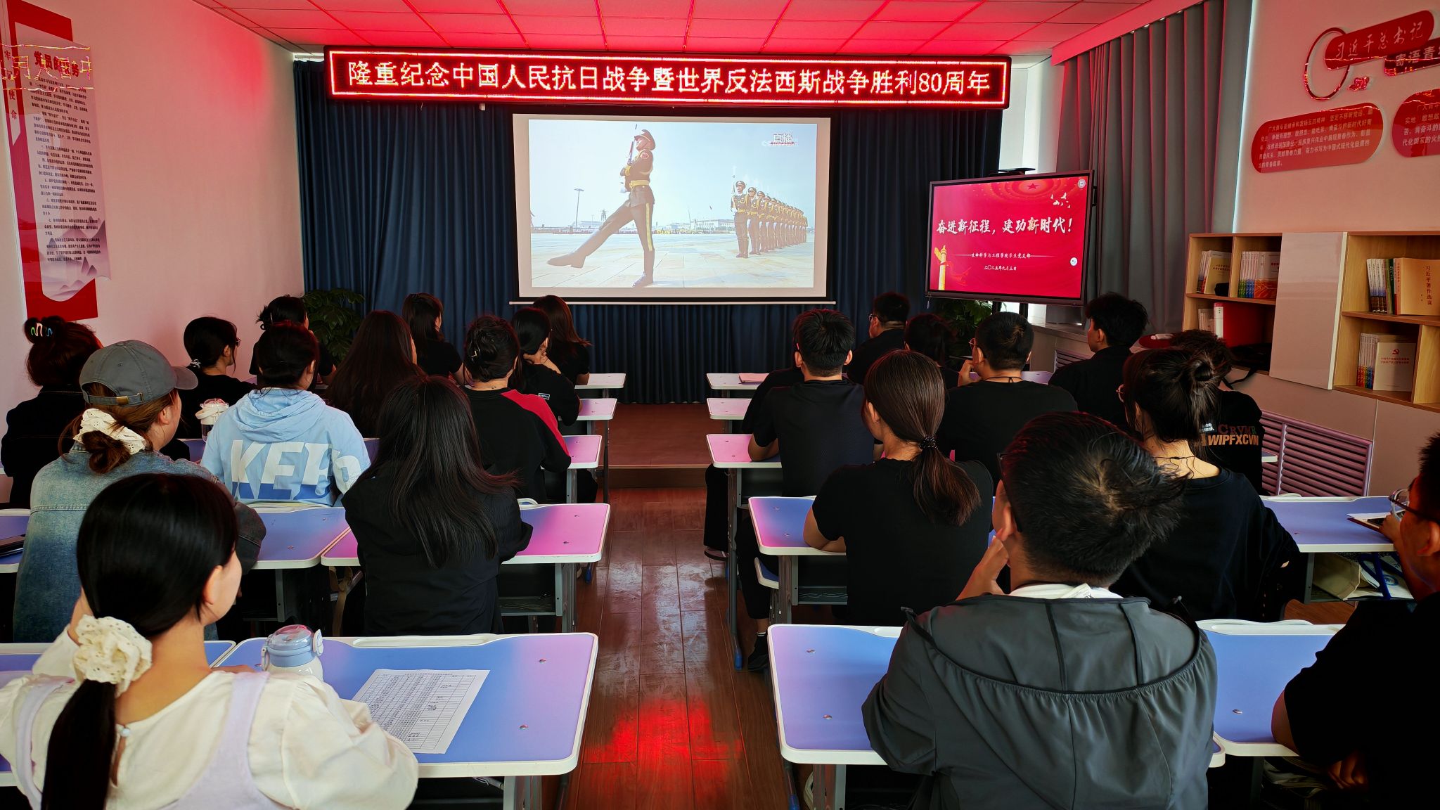 9月3日上午,365英国上市官方网站学生党支部组织全体党员、共青团员代表在六教402会议室集中收看中国人民抗日战争暨世界反法西斯战争胜利80周年大会阅兵仪式直播,共70余人参加。